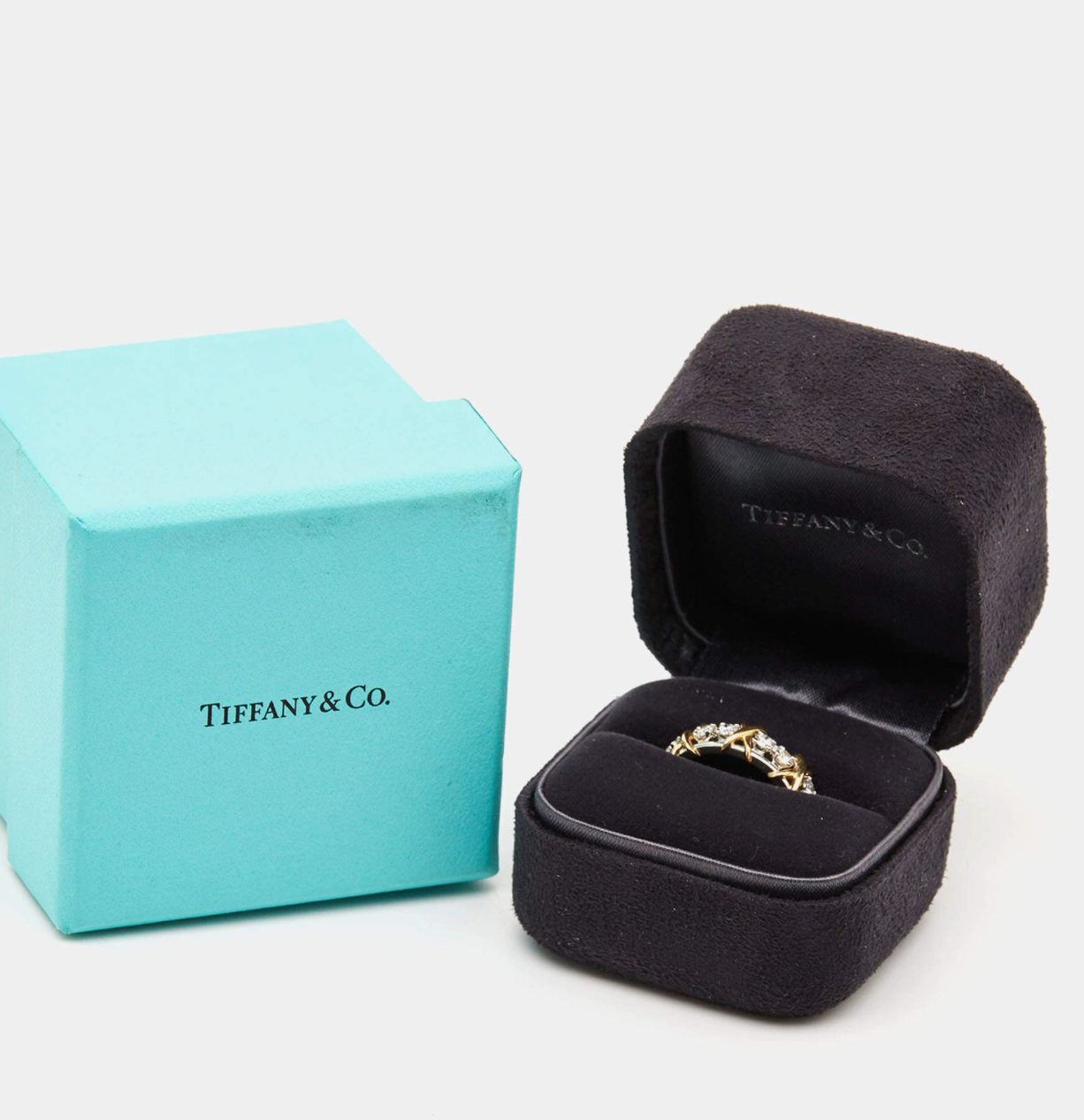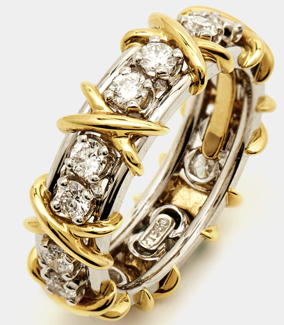 Его дизайн вдохновлен природой и просто чудесен. Линия Sixteen Stone Rings уже давно является иконой Schlumberger и одним из самых популярных колец Tiffany & Co. Эта полоса была выбрана из этой самой коллекции, и она сделана из платины и 18-каратного желтого золота и украшена круглыми бриллиантами классической огранки, которые помещаются на два и чередуются с буквой X, англосаксонским символом любви, который был переосмыслен Жаном.