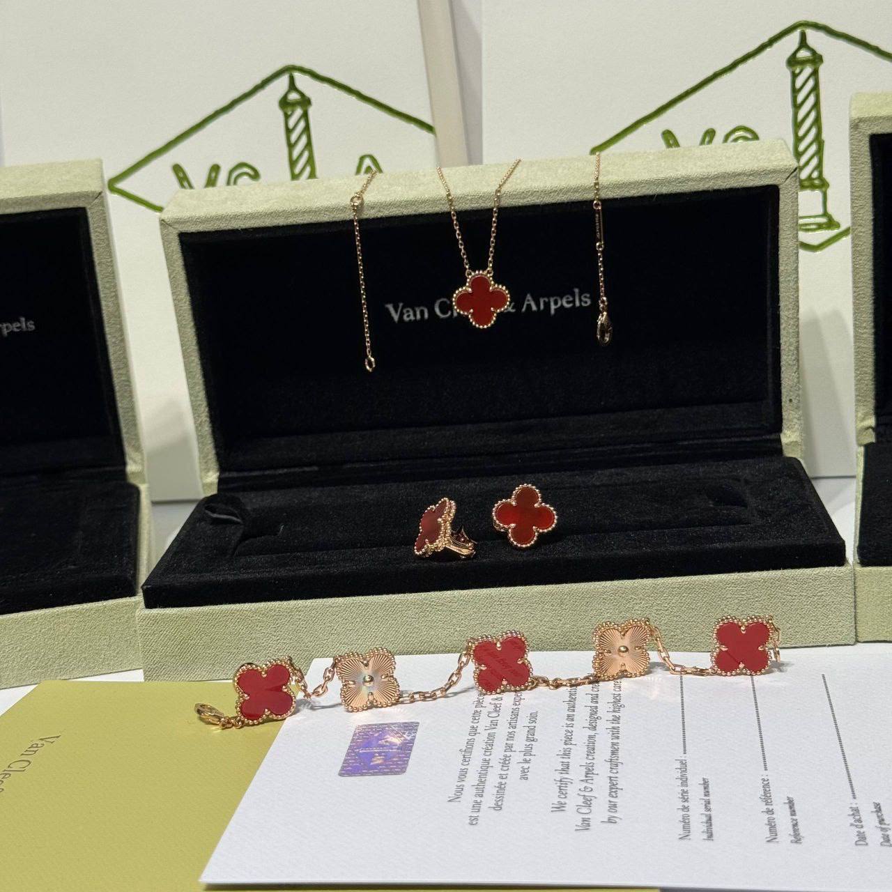 Модели Vintage Alhambra следуют стилю украшений Alhambra от Van Cleef & Arpels 1968 года и отличаются вневременной элегантностью. Форму этих легендарных символов удачи, навеянных образом четырехлистного клевера, подчеркивает обрамление из золотых бусинок.
