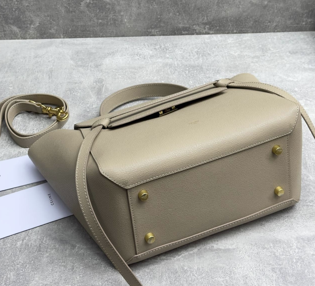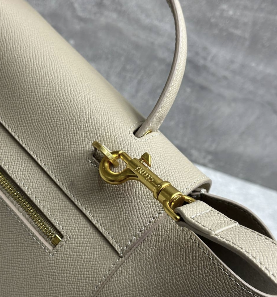 Миниатюрная серая сумка Belt полностью оправдывает свое название, так как она украшена узким ремешком на клапане. Аксессуар с короткой ручкой изготовлен из зернистой матовой кожи. Классическая модель украшена золотистым логотипом марки. Внутрь поместятся кардхолдер, телефон и ключи.