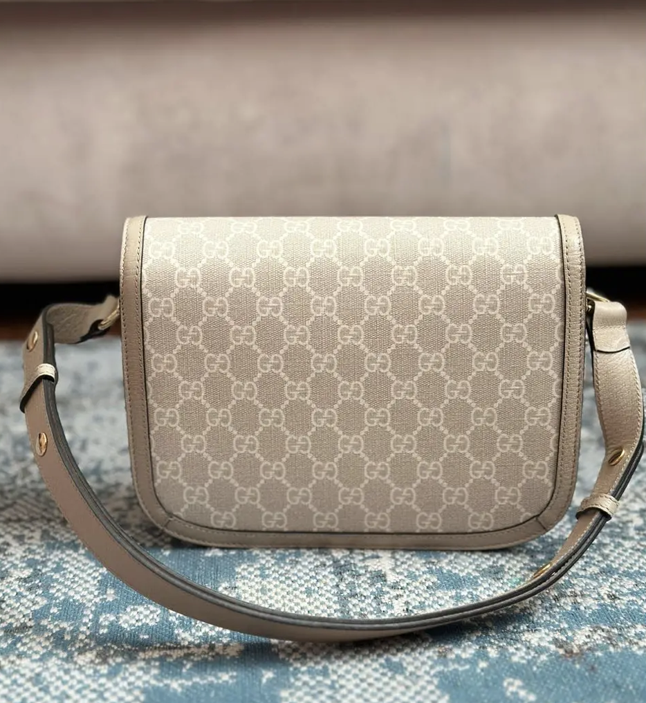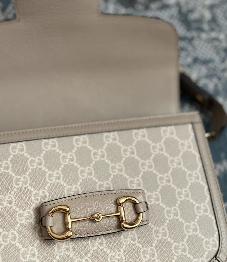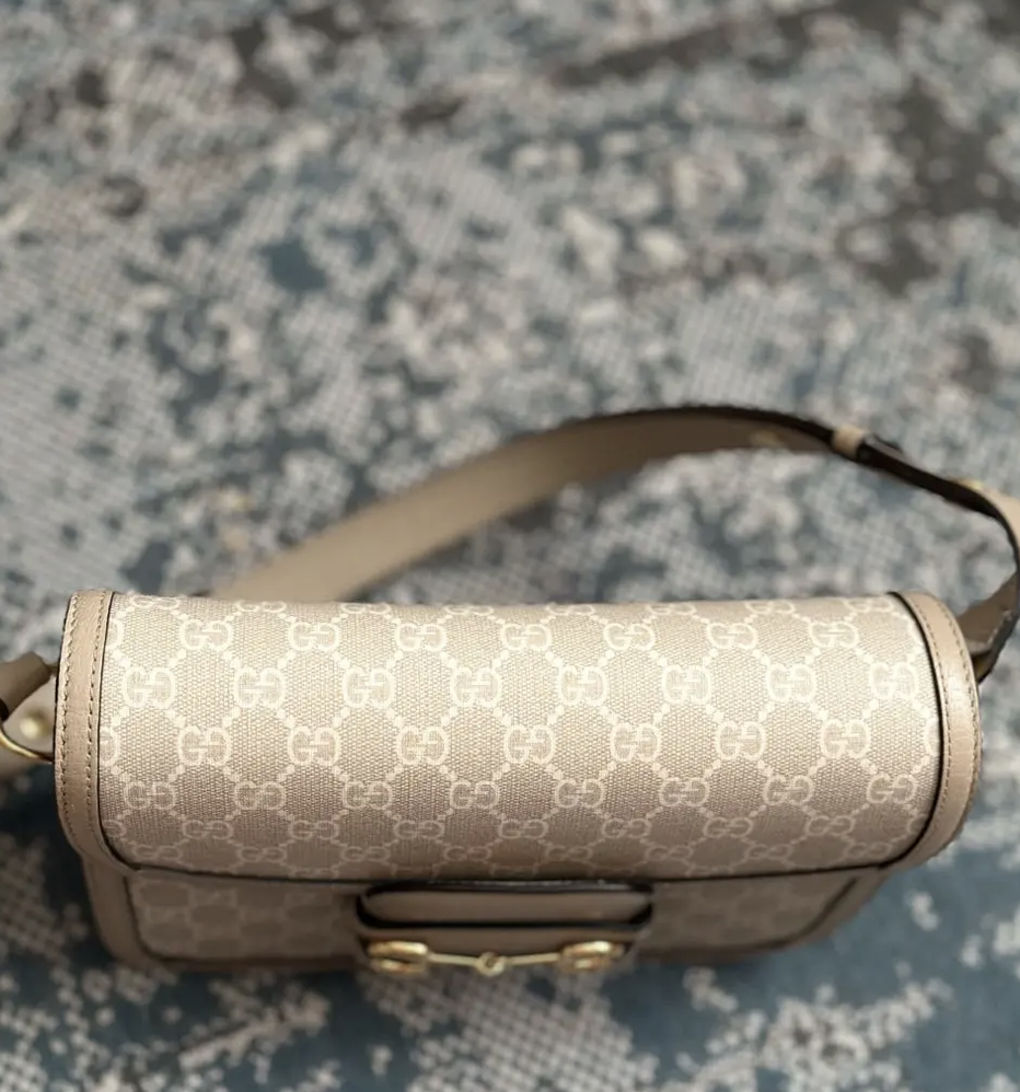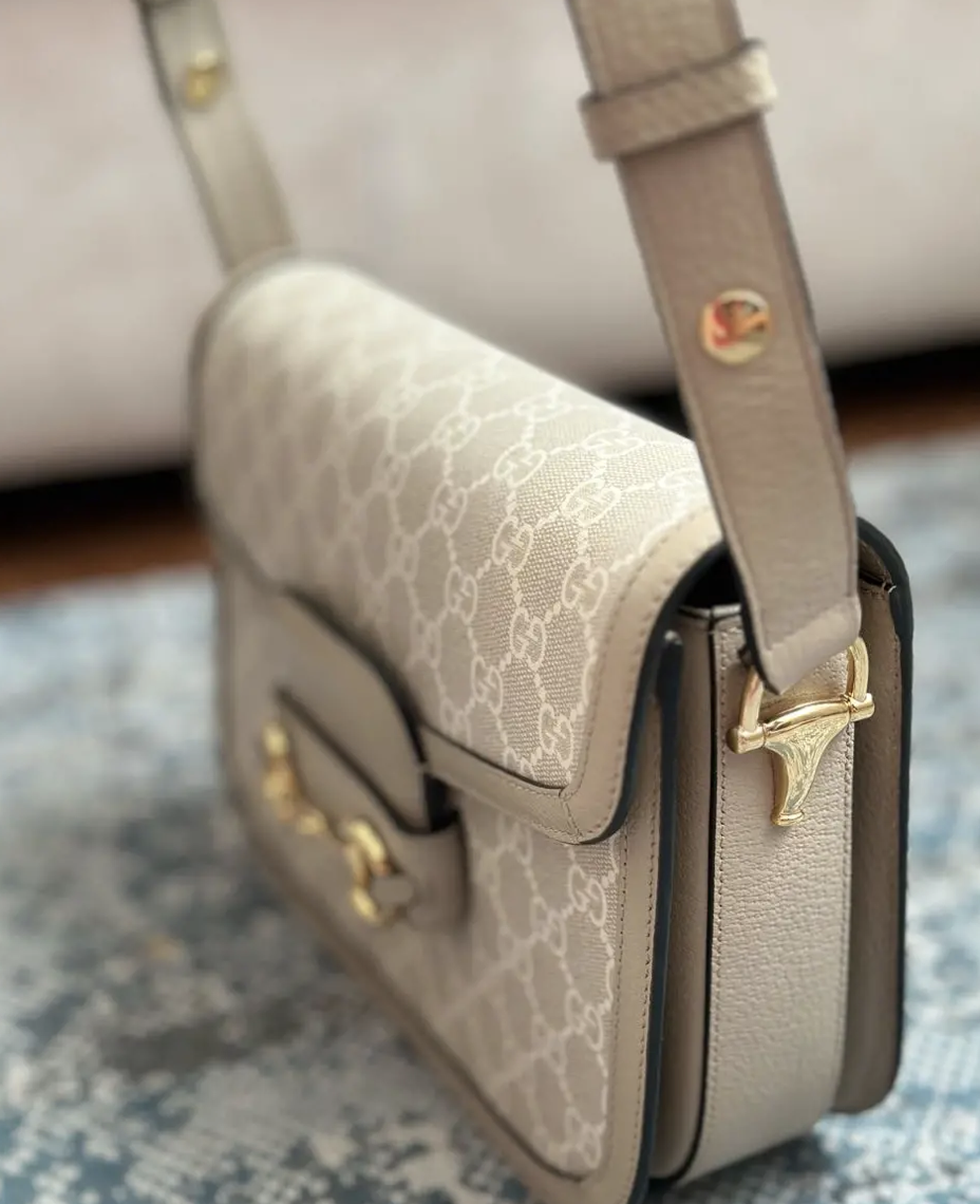 Сумка на плечо Gucci Horsebit 1955 воссоздана по архивному дизайну. Аксессуар повторяет модель, впервые представленную более 60 лет назад. Деталь Horsebit, состоящая из двух колец и планки, стала одним из легендарных символов Дома, заимствованных из конного спорта. В дизайне маленькой сумки на плечо с застежкой-клапаном она сочетается с фирменной тканью Дома с узором в виде монограммы. Модель дополнена механизмом регулировки длины плечевого ремня, который позволяет носить сумку на плече или через плечо.