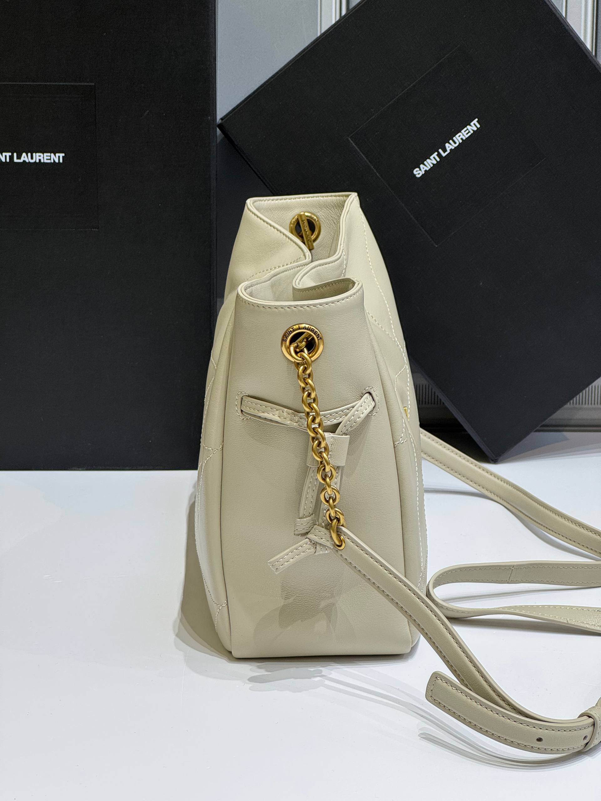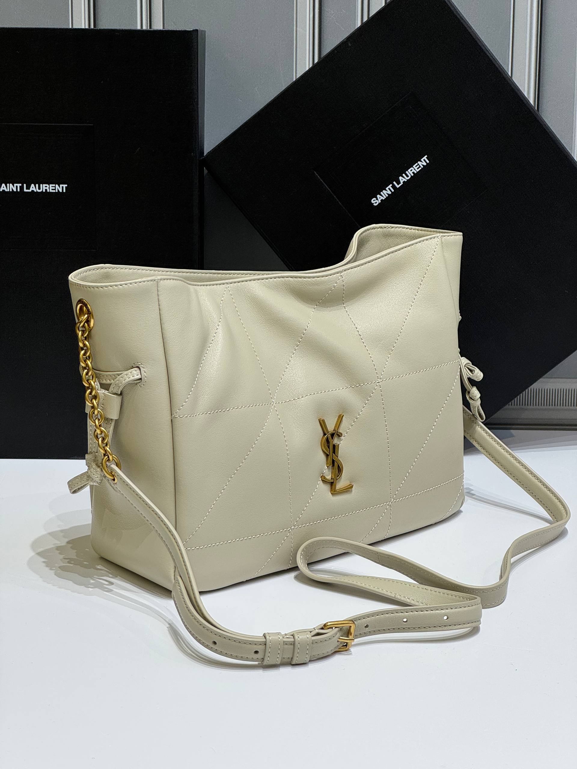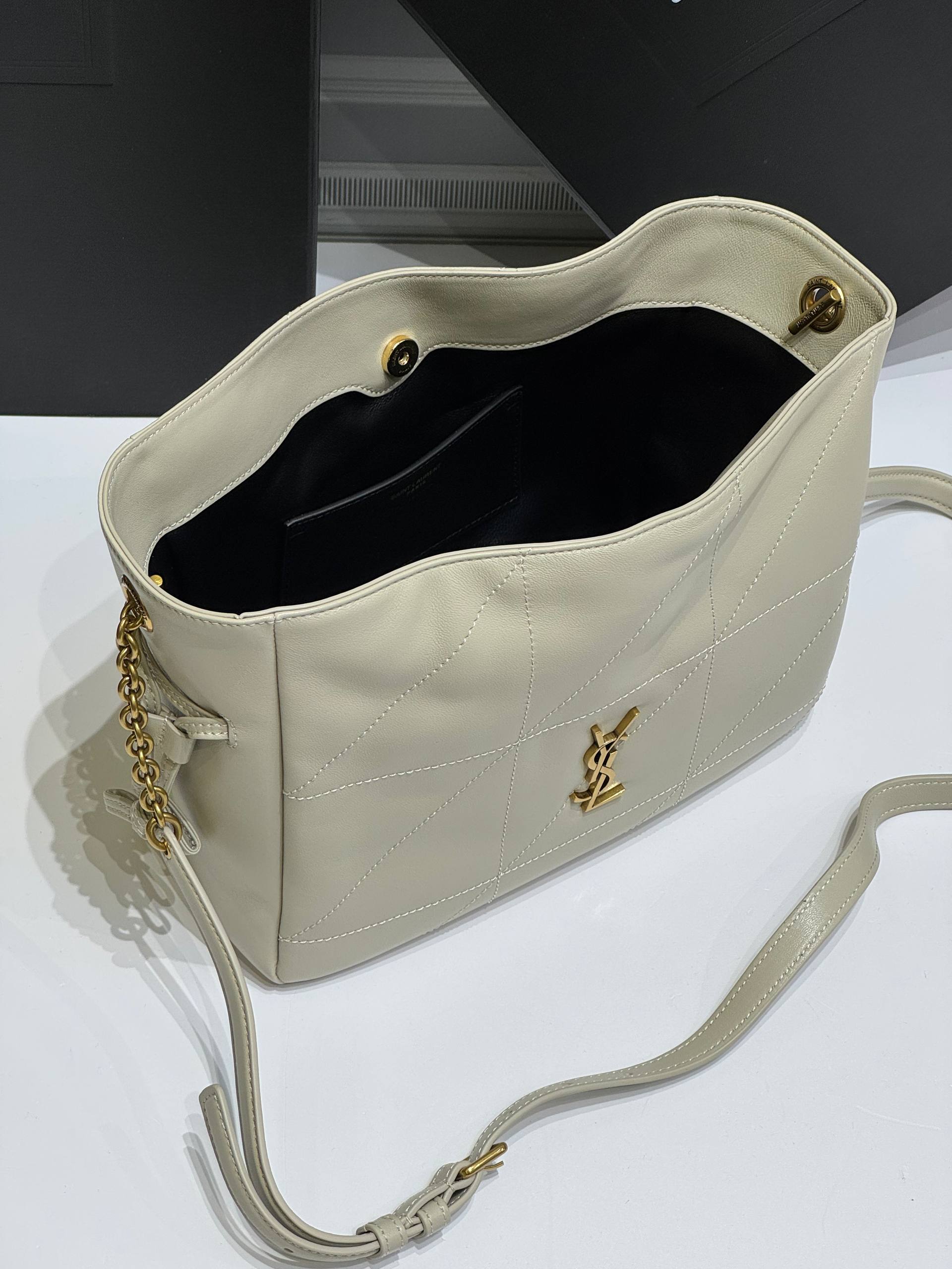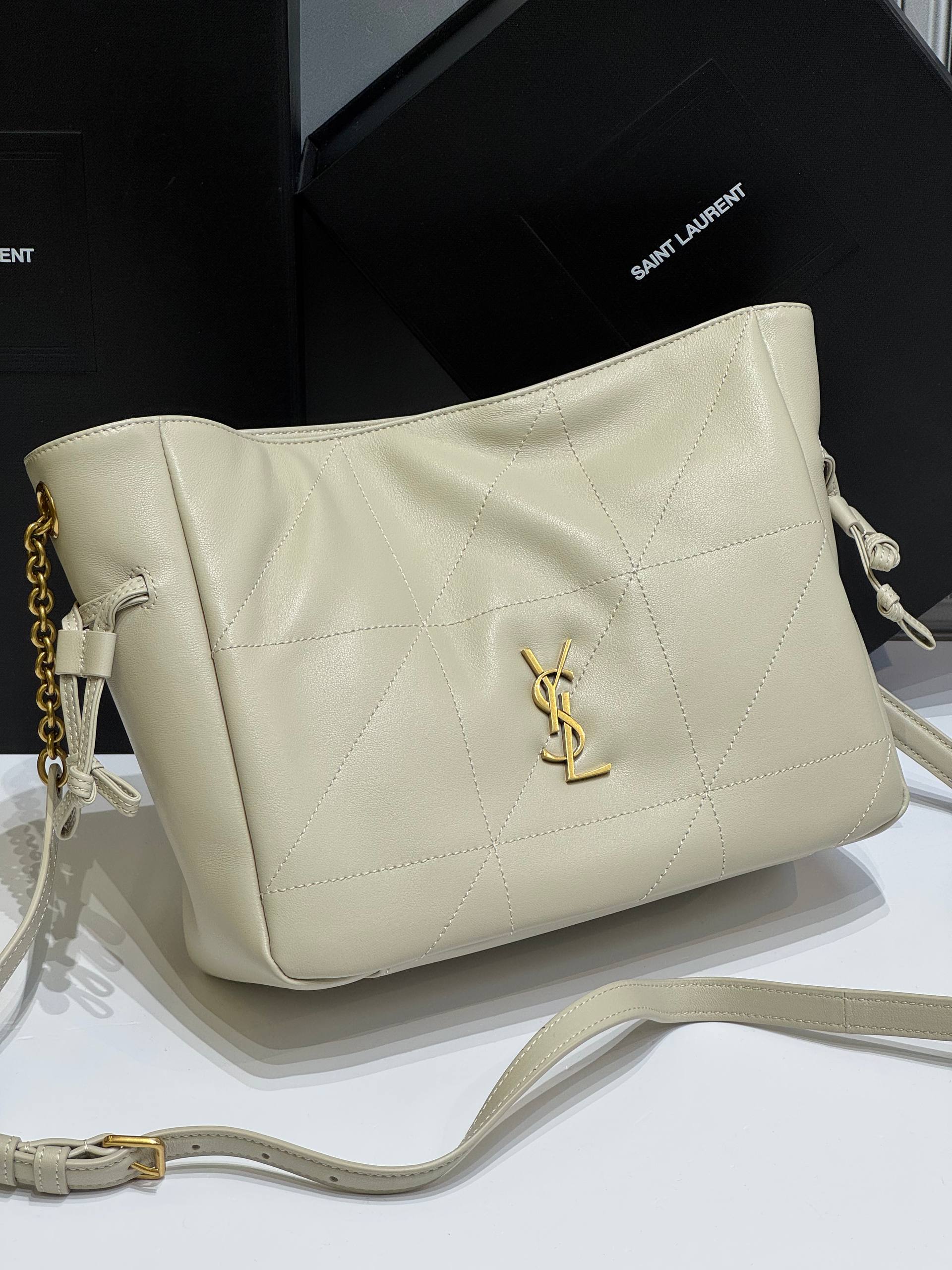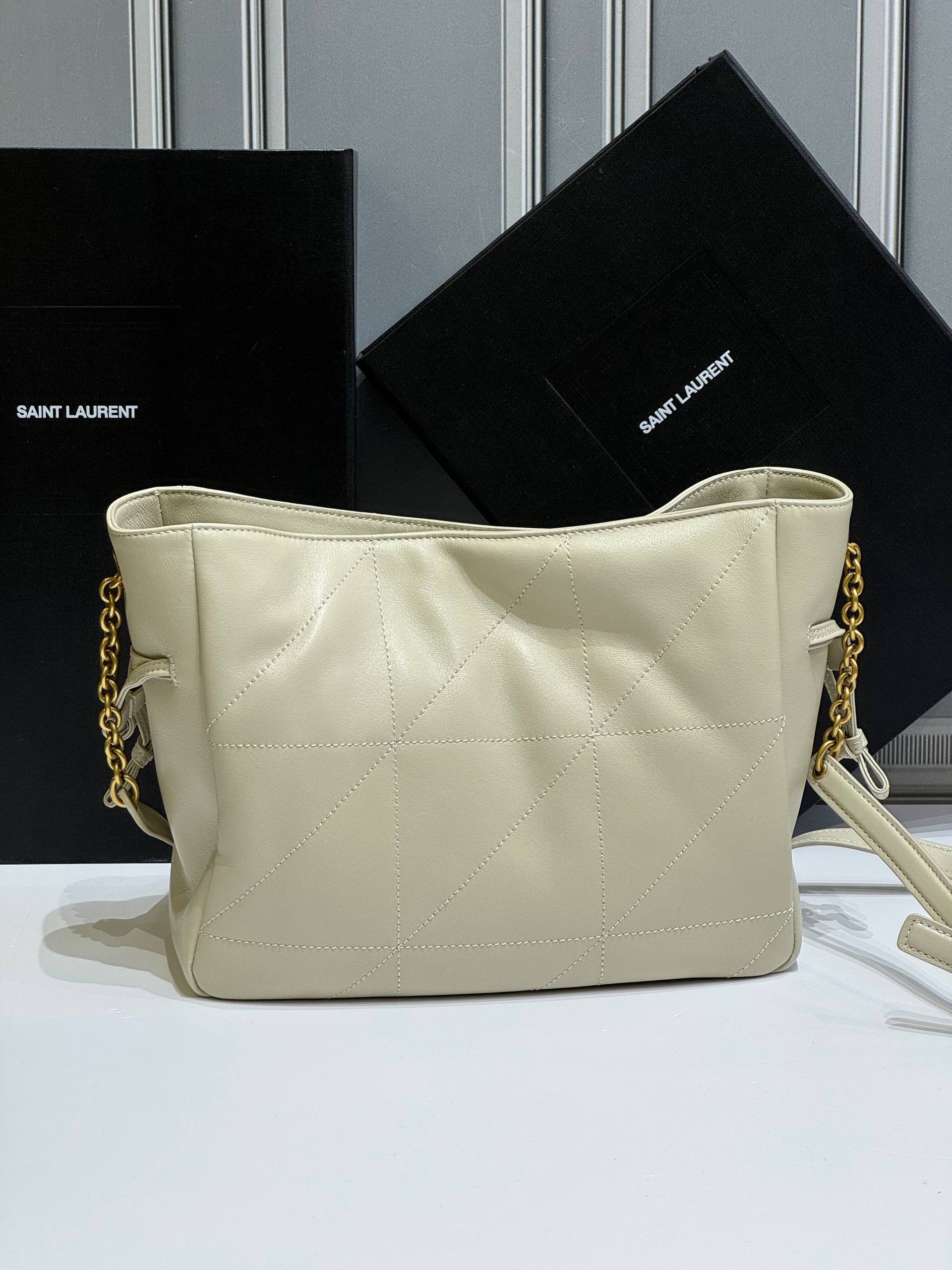 Версия JAMIE из мягкой наппа, украшенная строчкой CASSANDRE и CARRÉ RIVE GAUCHE. Эта легкая и простая сумка имеет цепной ремень и съемный карман на молнии. Цепочка и завязки на шнурке позволяют затягивать или расширять стороны, создавая различные силуэты.